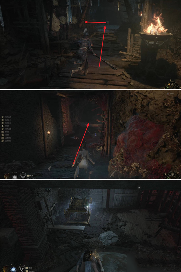 3.地下监牢:从神龛出发,先走提前打开的近路门,然后一路向下走楼梯,到达一个布满机关的通道。在通道处往左边走,能看到一个大布袋和一个新娘怪,从它们背后的路前进。不久后会看到两个石球从右往左滚,跟着石球走到通道边缘并跳下去,进入牢房后,就能看到宝箱,打开可得到羽族遗骸。