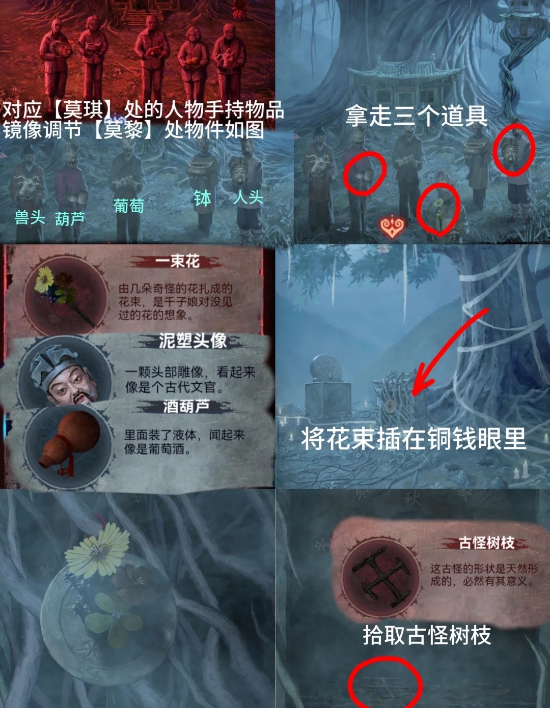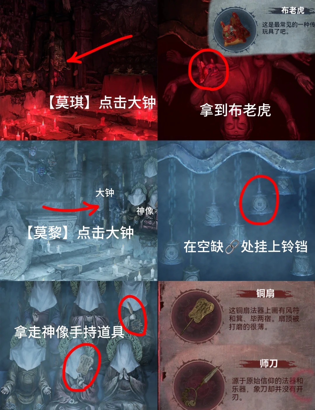 10.红色:进入塔内,点击左边佛像,使用大铜钱,根据之姐姐视角钟下铃铛线索点击,获得【三牲首像】和盘子图案线索。