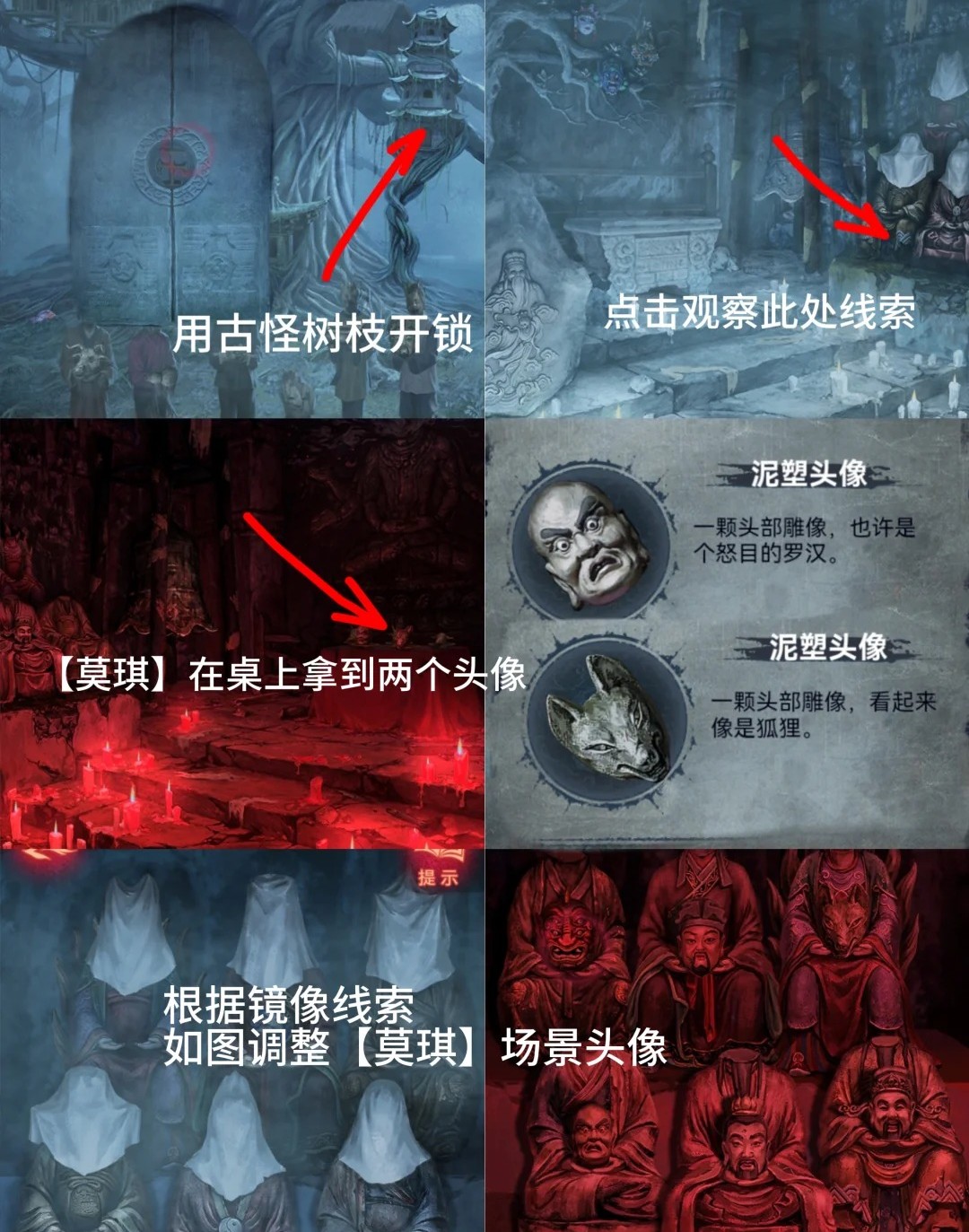 红色:进入左边石塔,点击右边桌子获得两个【泥塑头像】,点击左边无头佛像把泥塑头像都放上,根据姐姐边线索对应调整位置。