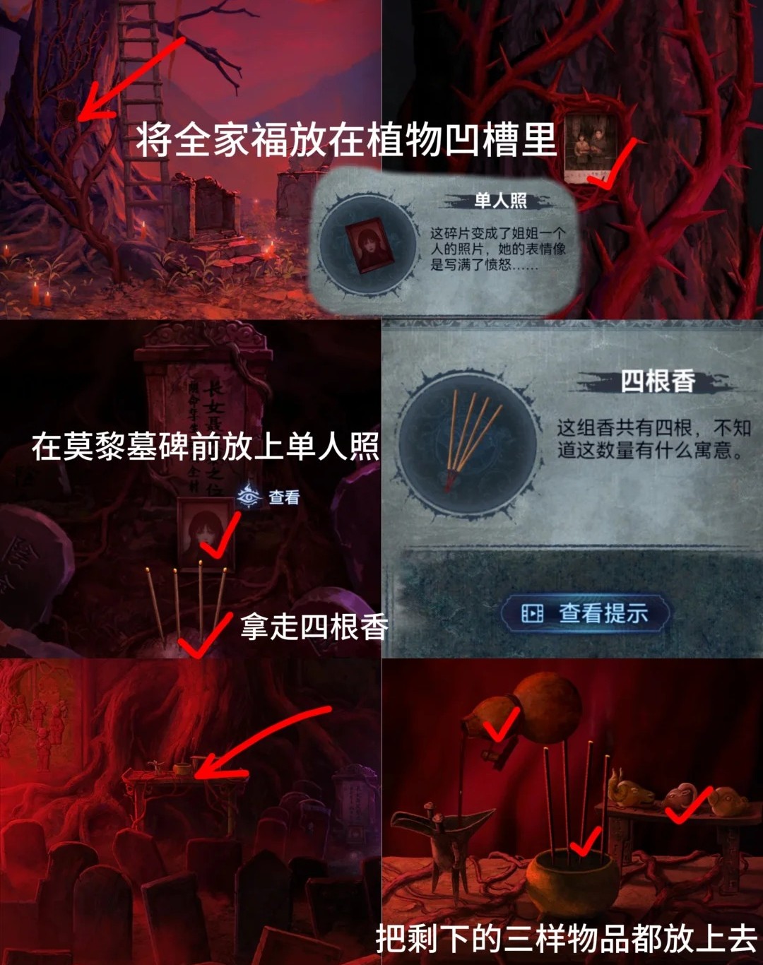13.红色:回到大树处,点击树,放入全家福,获得【单人照】。来到庙内点击右边的墓碑,放上单人照,获得【四根香】,点击中间供桌,倒入酒,放上三牲首像和四根香。
