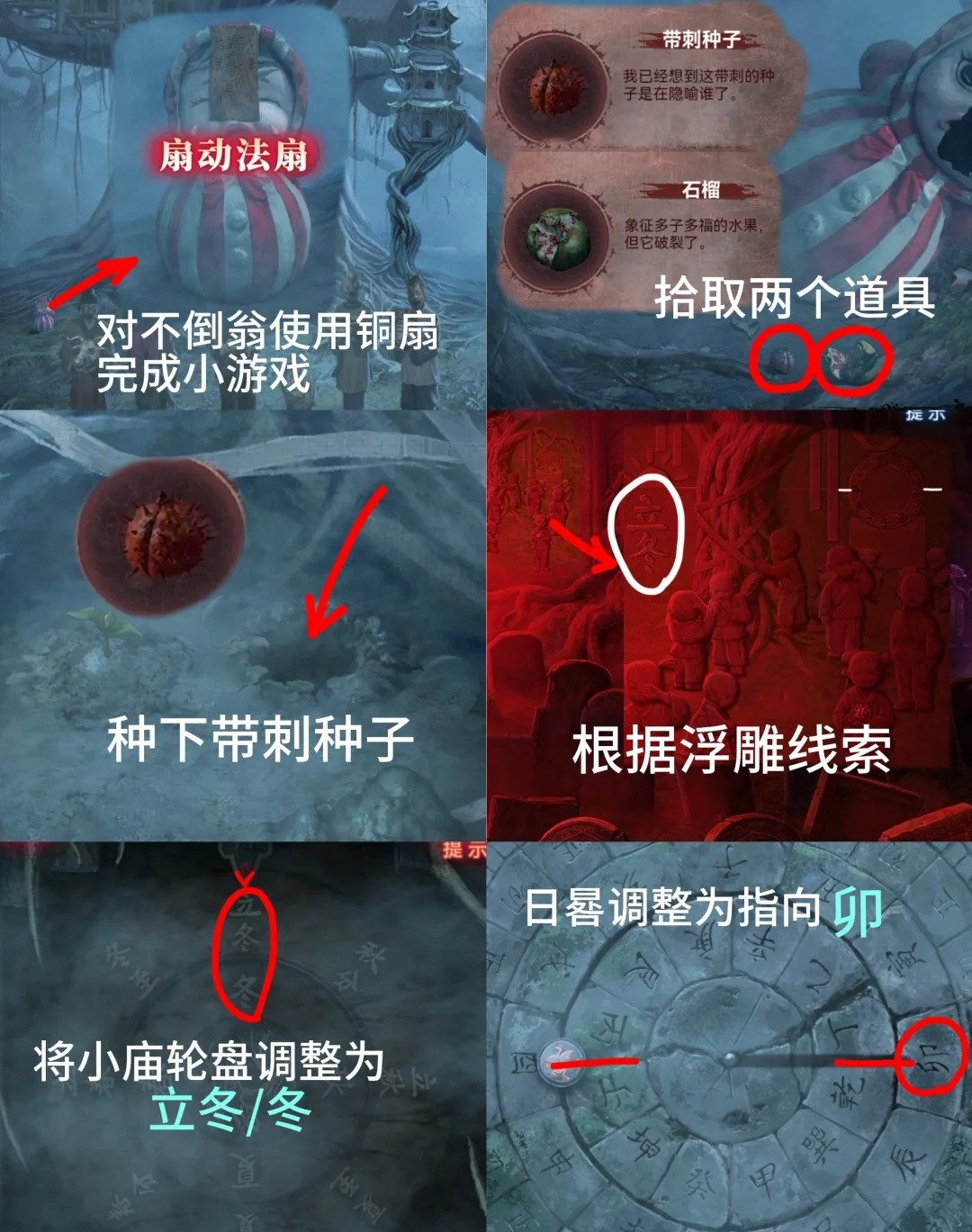 12.白色:到大树处,点击不倒翁,使用铜扇,完成小游戏获得【带刺种子】、【石榴】,回到日冕处,将种子放入坑中,根据妹妹那边中间小庙左边壁画线索,将日晷调至卯,石碑调至立冬冬,另一个种子也发芽了。