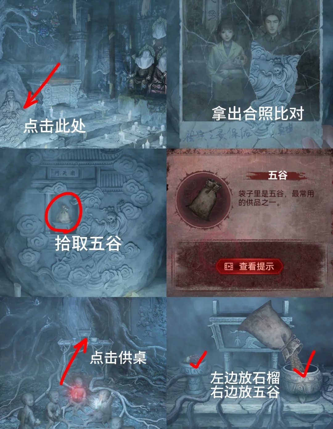 14.白色:获得照片,进入塔内,点击左边石像浮雕,使用照片,获得【五谷】,进入中间的庙,点击供桌放入五谷和石榴,过完剧情完成小游戏。