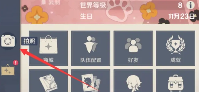 1、进入到游戏后,电脑端按ESC键,手机端点击个人头像,打开菜单,然后点击相机标志。