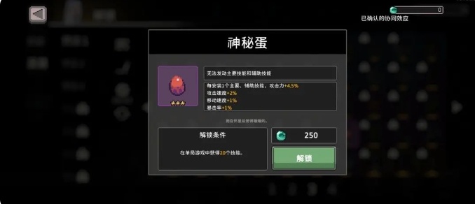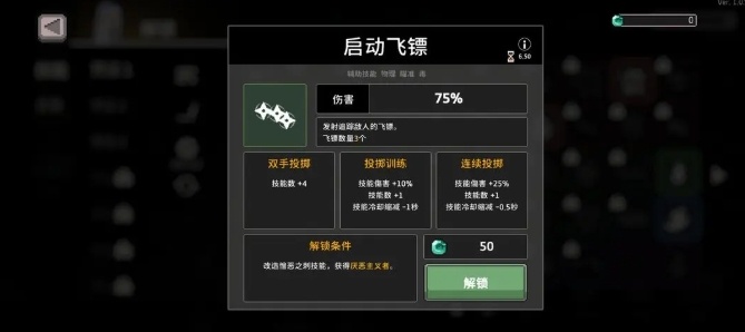 1.憎恨之刺:游戏伊始,进入解锁界面,将除“憎恨之刺”外的所有技能禁用。只携带“憎恨之刺”进入游戏,在首个BOSS关前,尝试在黑商处对其进行特殊改造(需三星技能,成功则变为四星,失败不可二次改造)。成功改造“憎恨之刺”是解锁“启动飞镖”的必要条件。若改造成功,可直接放弃游戏节省时间;若失败,重新开始游戏直至改造成功。