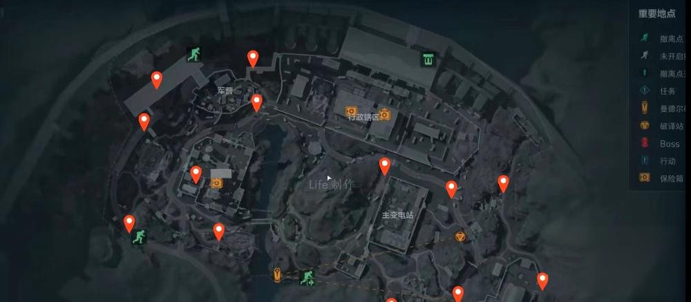 主楼(行政辖区):东楼及军营复活可直冲,内有3-4个保险箱及集装箱物资,风险高回报高。