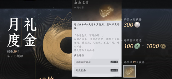 1.即时到账奖励:当玩家购买月度礼金后,会立即获得300长鸣珠。长鸣珠在游戏里的地位举足轻重,它类似于其他游戏中的点券,是一种通用的付费货币,在游戏商城中发挥着重要作用。