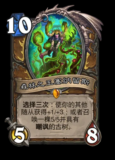 塞纳留斯基本可以看成一张强力站场卡,而灌注德正好就是铺场职业,虽然10费的费用过高,但标准新版本的大解牌偏少,所以这张卡还是有一定的发挥空间。从优势局考虑,这是一个10费的大嗜血提供斩杀或者9血的站场buff,除了绝命乱斗之类的硬解基本无法处理;劣势局考虑,这是一个20点场攻的返场,压力也是有一些的。所以我认为能达到3.5分,而发现出来的话,1费的嗜血也能提供斩杀,但另一个选项则是有点笨重,综合给个3分。