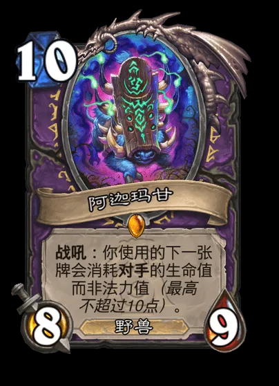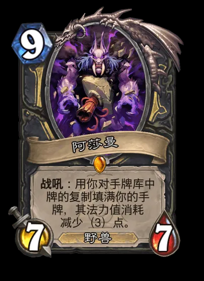 阿莎曼这张卡对于盗贼来说过于笨重了,虽然它的效果确实很不错,但是盗贼真的是一个缺手牌资源的职业吗?无论是过牌还是补牌能力,应该都是瓦莉拉的优势区间,9费的它能给贼补多少资源这一点真不好说,因为贼很有可能一直手牌都是快满的状态。虽然给的牌能减3费,但操作空间依然有限。但话又说回来。潜行者一向是以奇迹著称的职业,说不定会有一些不错的玩法?先保留意见给个无功无过的3分吧。而和乌索克相同,如果被玛洛恩发现出来只要1费的话,那操作空间可就太大了,因此发现出来的1费阿莎曼我认为能给到4.5分的强度。