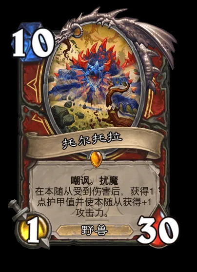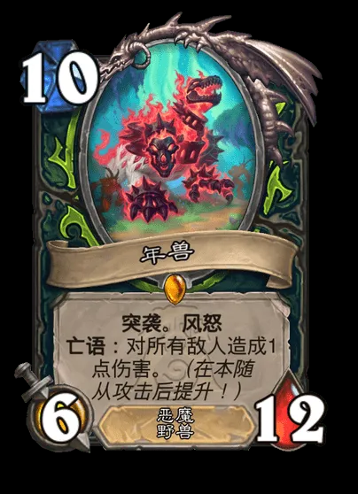 设计师还是忘不了他的大恶魔瞎,但10费下个这玩意属实有点幽默 ,瞎子需要突袭风怒解场不如手搓一个星舰出来。不过大致看了一下瞎子的新卡,还是有几张不错的配合卡的,感觉真玩出来了也能靠它的亡语磨死对面,而且相较于年兽为核心大恶魔体系,我个人感觉主推的另一套魔种体系更拉跨,所以我认为能给个3分;发现出来的话,1费突袭解场,然后亡语补刀这些效果也不错,给3.5分。