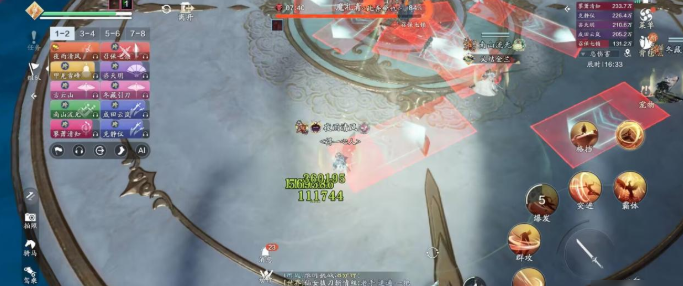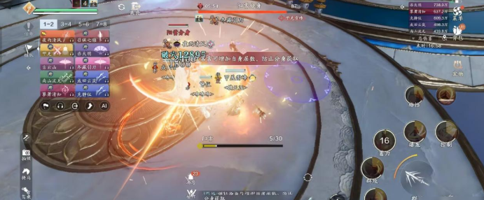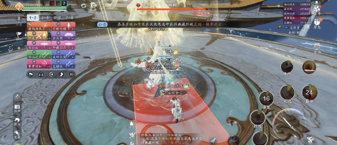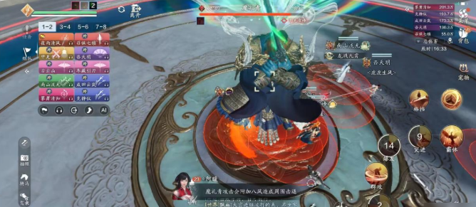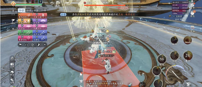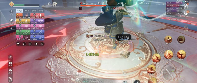 2.天绫困:哪吒将玩家击退至场地边缘,随机点名2/4/6/8名玩家(随释放次数上升)用混天绫捆住,并拉向哪吒自身(秒杀)。被捆住的玩家要点击【挣扎】,其余玩家则需快速过去,帮助其打散混天绫,解救队友。