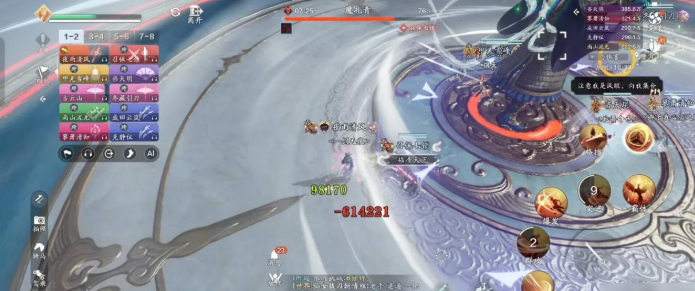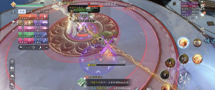 1.雷法化身:进入二阶段,杨戬会化身阴阳之雷的分身在两边平台,平台上有传送点,可在两个平台间进行移动。玩家需要分成两个小队分别行动,并随时向队友报告各自平台分身的血量。因为分身剩余气血一旦相差超过15%,则气血多的分身会立即对另一方进行治疗,回复10%气血,所以要保证两队输出均衡。