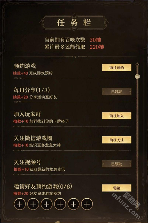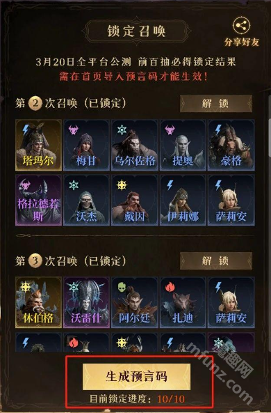 1.获取抽卡机会:3 月 10 日 18:00 开始,去「预言召唤」活动页面做任务就能拿抽卡机会,最多能有 250 次!像预约游戏、分享活动、加玩家群、关注各种官方渠道、邀请好友预约这些,都能拿到抽数,动动手指的事儿~