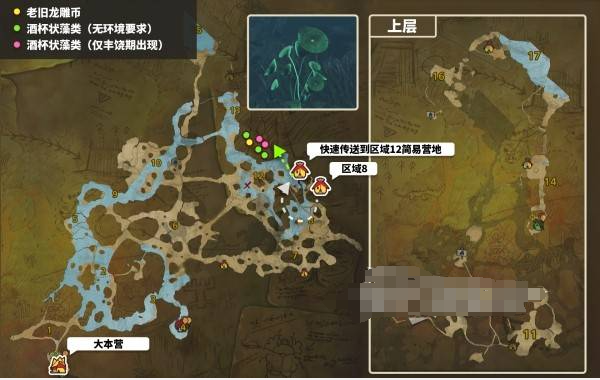 收集完所有的老旧龙雕币和酒杯藻后,返回区域8,在营地休息,此时地图上的老旧龙雕币和酒杯藻就都会刷新了,回到步骤2重复整个流程,直到集齐所需数量。