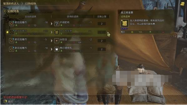 根据上文所述,前往冰雾断崖区域20寻找柳浪(地图上会显示以物易物图标),注意这里如果之前去与柳浪对话过的话,此时直接在大本营与纳塔交谈再选择柳浪即可进行以物易物,无需再前往冰雾断崖。如果交换列表里没有出现老旧龙雕币,可以在营地中休息来刷新交换列表。