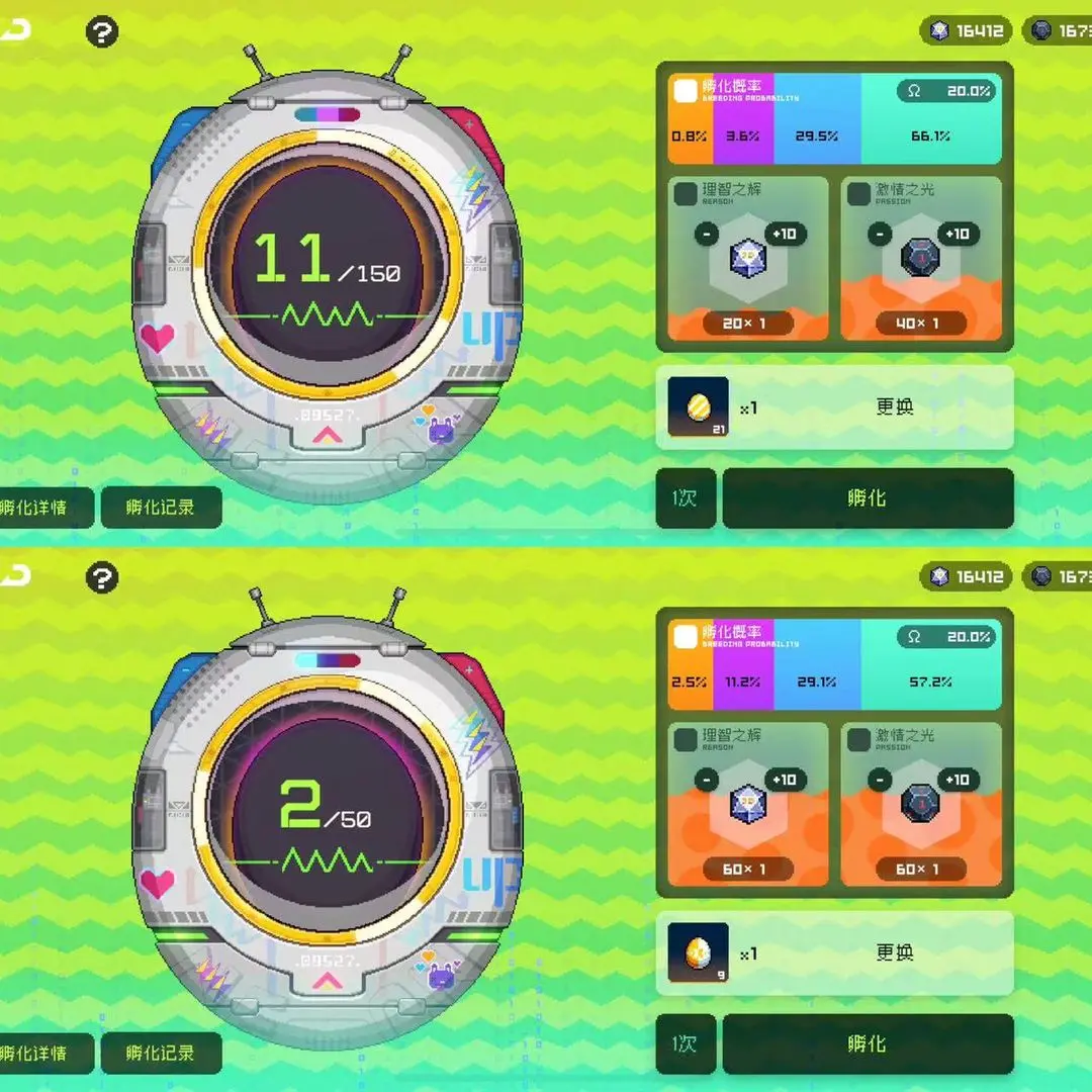 此外,玩家还可以通过使用特定道具来提高孵化概率。例如,在普通孵化仓中使用60个理智之辉和60个激情之光,可以将橙色宠物的孵化概率提升至2.5%;而在小型孵化仓中使用30个理智之辉和30个激情之光,则可以将橙色宠物的孵化概率提升至0.8%。