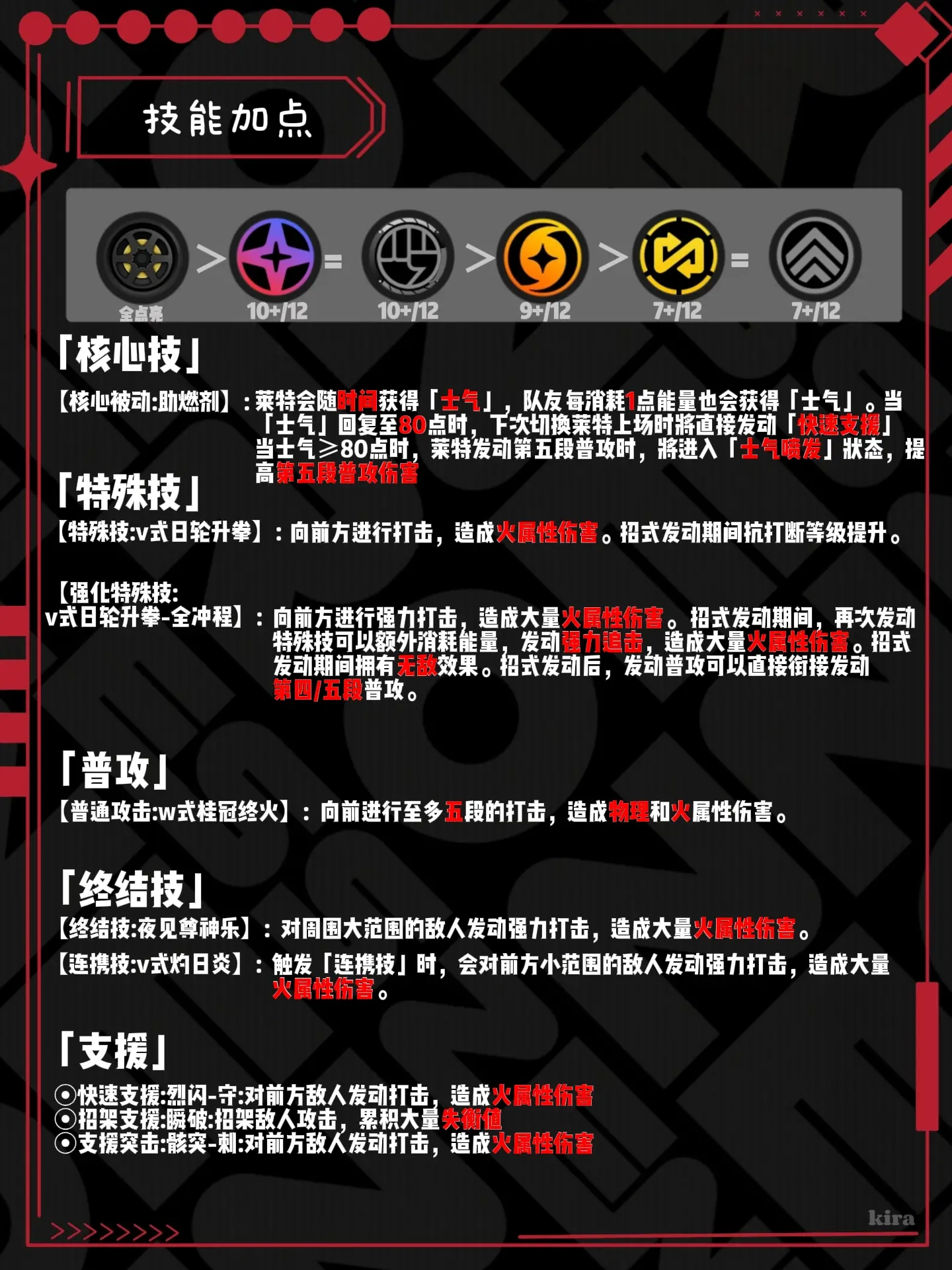 强化技能与特殊攻击:强化状态下,莱特消耗士气增强冲击力,快速打出失衡状态并延长敌方失衡时间。强化特殊技可造成高额火属性伤害。