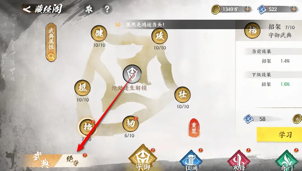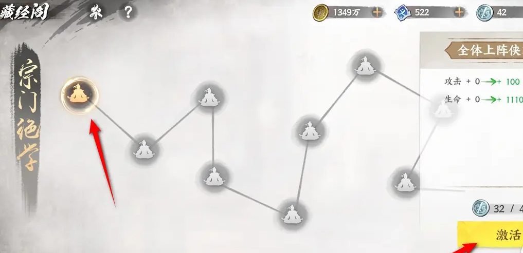 在藏经阁中,您将看到各种宗门绝学。选择心仪的绝学后,点击“激活”按钮,即可将其纳入您的武学库。