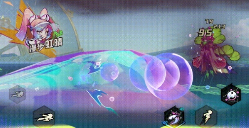技能效果:召唤幸运水浪,凝结成超级泡泡糖。泡泡糖破裂后形成无数水波泡泡,命中敌人时造成水元素伤害,自身接触则回复生命值。