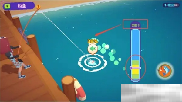钓鱼过程中,注意进度条和指针。当指针进入黄绿色区域时,点击“钓鱼”按钮可加速钓鱼进度。在有限尝试次数内,达到100%进度即可成功钓获。