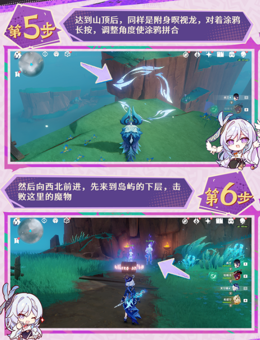 2.靠近小岛时,系统会自动为你接取任务,开始解谜之旅。登岛后,根据提示找到指定位置,附身瞑视龙扫描地上的印记。