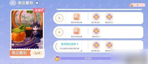 1级:解锁3种颜色小型瓜雕(橙、黄、褐),1-3星瓜雕,5种图鉴。