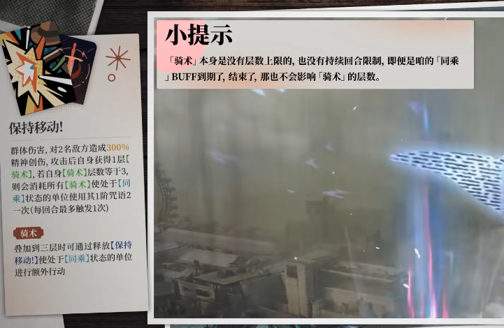 主动技能 - 保持移动!:群体攻击,对两名敌方造成精神创伤,攻击后获得骑术。若骑术达到一定层数,则消耗所有骑术,使处于同乘状态的单位使用其咒语。