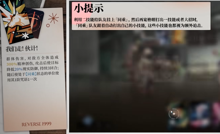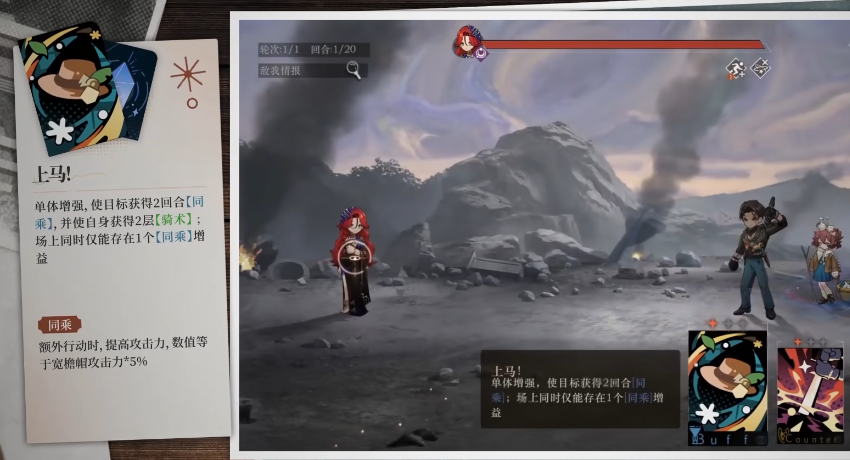 主动技能 - 上马!:单体增强,使目标获得同乘状态并使自身获得骑术。场上同时仅能存在1个同乘增益。