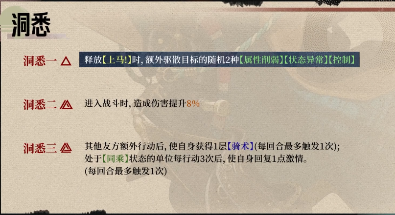 被动技能 - 戴头冲锋:释放上马!时,额外驱散目标的随机属性削弱、状态异常、控制。进入战斗时提升伤害,其他友方额外行动后,宽檐帽获得骑术。处于同乘状态的单位每行动一定次数后,增加自身激情。