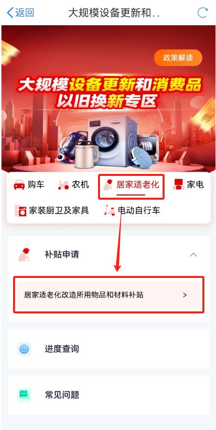2.选择“居家适老化”,点击“居家适老化改造所用物品和材料补贴”